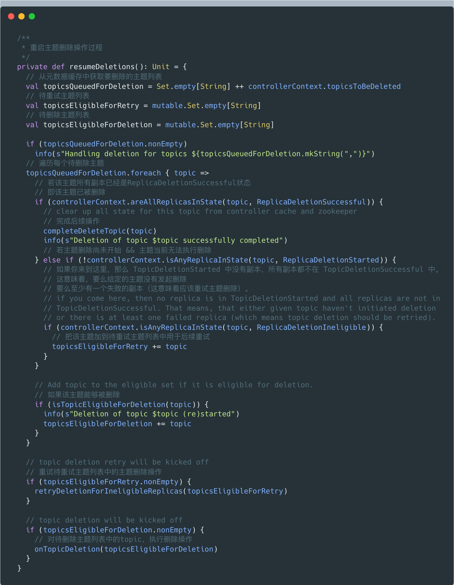 resumeDeletions串联起了TopicDeletionManger中的很多方法,较关键的: