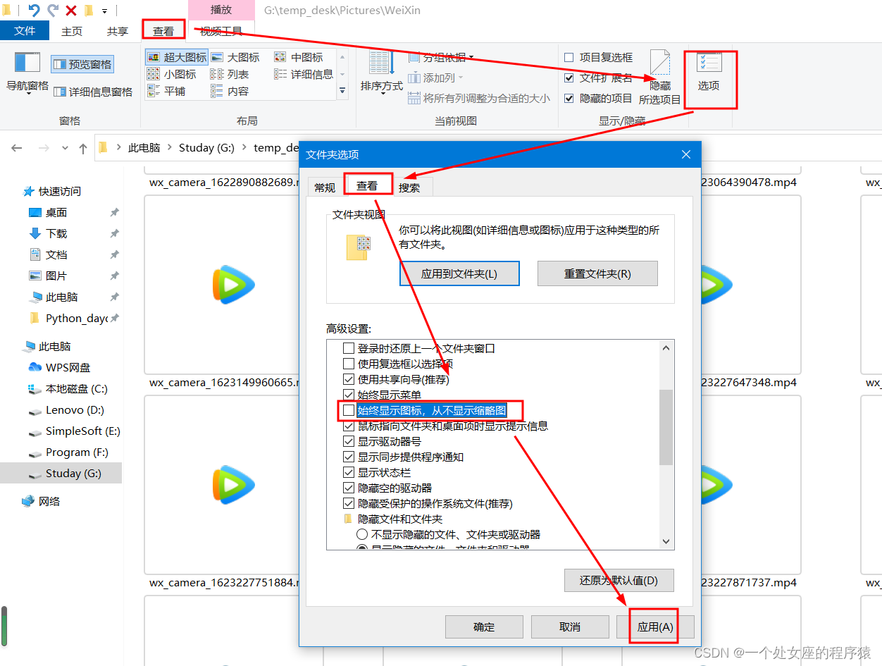 第二步,去掉勾选的“始终显示图标,从不显示缩略图”