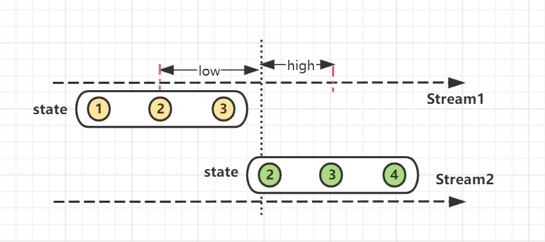 3.为每个进入的数据流保存state状态并创建定时器。在时间窗口内另一个流达到时进行join并输出,完成后删除定时器。