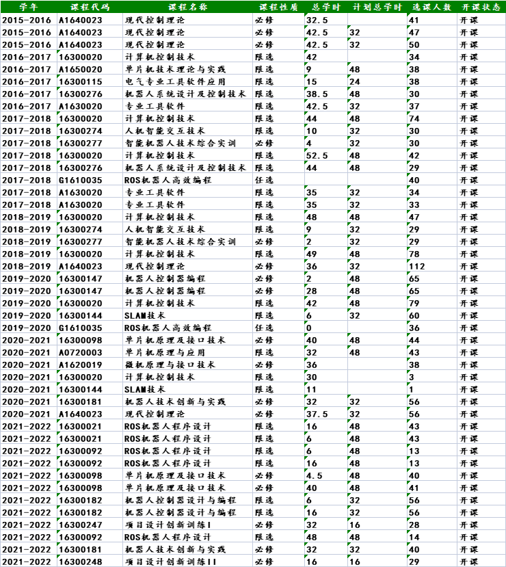 | 2021-2022 | 1 | 电气与自动化工程学院 | 16300092 | ROS机器人程序设计 | 限选 | 16 | 48 | ROS机器人程序设计-0001 | 1-8周 | 13 | 开课 |