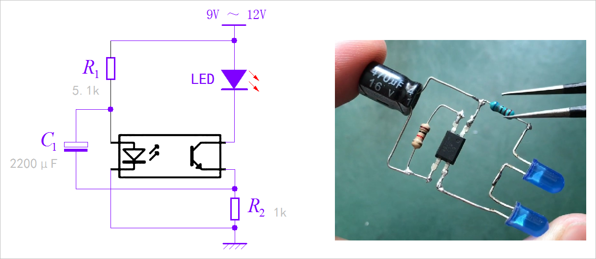 今天在西瓜视频中看到一个一分钟的短视频: 光耦可以这样用,你绝对想不到的小发明 展示了一个有趣的LED闪烁电路。核心是围绕找一个光耦(型号不详),外部增加相应的阻容和LED与器件,构成一个闪烁电路。