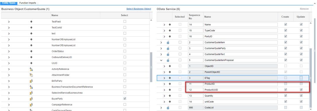 因此我们需要将BO对应路径下面的ProductUUID字段添加到OData模型中去。这里能观察到ProductID的Create和Update是没有勾选上的,而ProductUUID则支持Create和Update,这个行为和C4C销售订单行项目创建的标准实现有关——消费者需要提供待创建行项目包含的产品UUID,然后C4C会根据UUID到系统中查询出对应的产品,显示其ID到UI上。如果消费者在调用OData服务时,没有指定ProductUUID,则行项目创建逻辑不会执行。