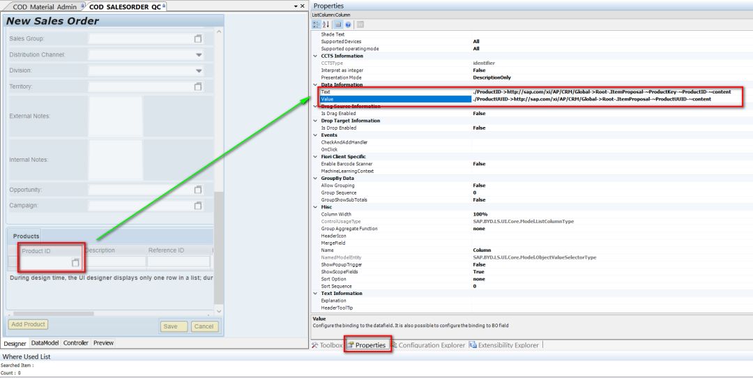 **Jerry答:**现在我们换一种方法,打开Cloud Application Studio的UI Designer,定位到销售订单创建页面的UI模型COD_SALESORDER_QC, 找到Product ID字段,在它的Properties面板里即可看到这个Product ID字段绑定的BO字段的名称和完整路径: