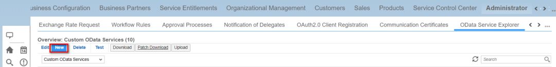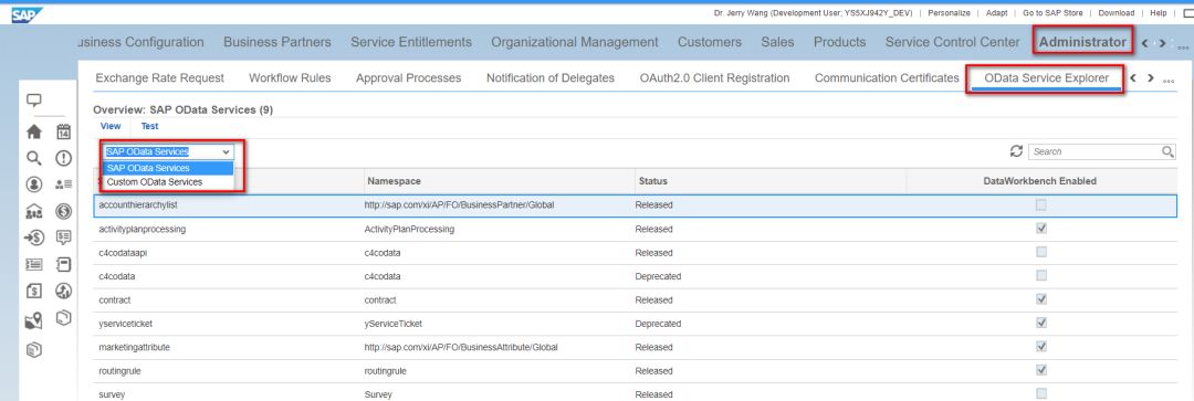 登录C4C系统,访问工作中心Administrator,工作中心视图OData Service Explorer,这里可以在SAP发布的标准OData服务和客户自定义的OData服务之间切换。
