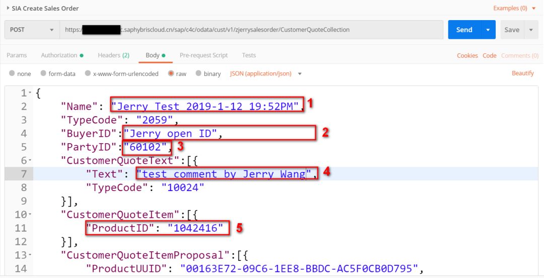 关键在于HTTP Post请求的请求体。下图高亮部分是我在HTTP Post请求里指定的创建销售订单的输入数据: