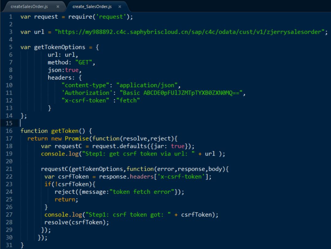 下面的代码使用nodejs提供的request模块向C4C请求CSRF token。注意第3行的url和第11行的Authorization头部的值,我都是用的虚假值,请大家替换成自己实际使用的C4C url和认证信息。