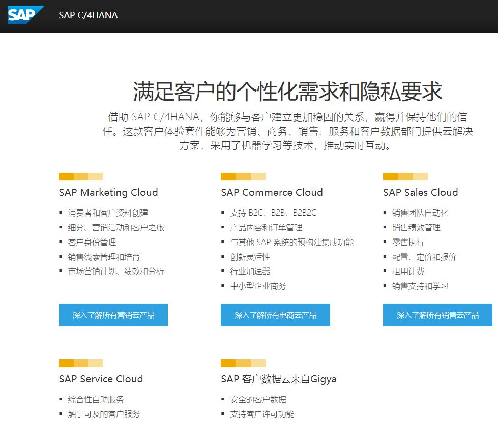 以前Jerry曾经介绍过SAP C/4HANA的五朵云到底包含哪些具体产品,其实在SAP官网上有更权威的中文解释: