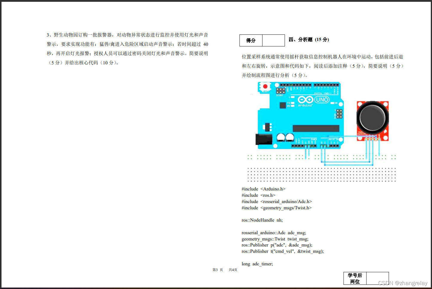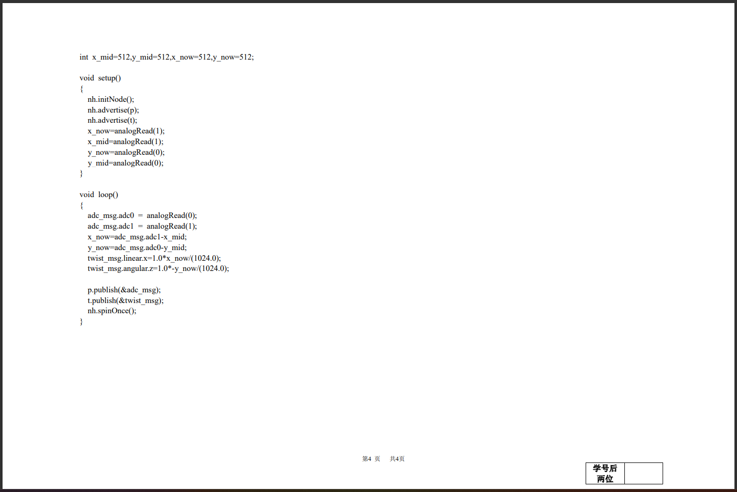 四、分析题 (15 分) 位置采样系统通常使用摇杆获取信息控制机器人在环境中运动,包括前进后退 和左右旋转,示意图和代码如下,阅读后添加注释(5 分),简要说明(5 分) 并绘制流程图进行分析(5 分)。