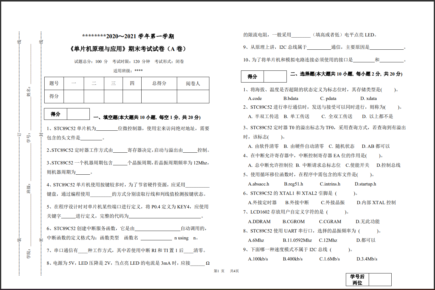 一、填空题(本大题共 10 小题, 每空 1 分, 共 20 分)
