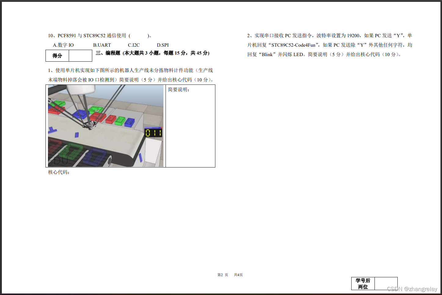 2、实现串口接收 PC 发送指令,波特率设置为 19200,如果 PC 发送“Y”,单 片机回复“STC89C52-Code4Fun”,如果 PC 发送除“Y”外其他任何字符,均回复“Blink”并闪烁 LED。简要说明(5 分)并给出核心代码(10 分)。