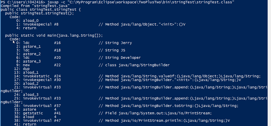 用javap将上面的Hello World程序反编译出来学习: