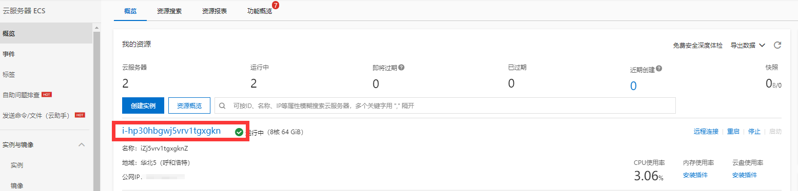 进入云控制台,点击左侧实例 ,然后从资源列表中点击资源名称