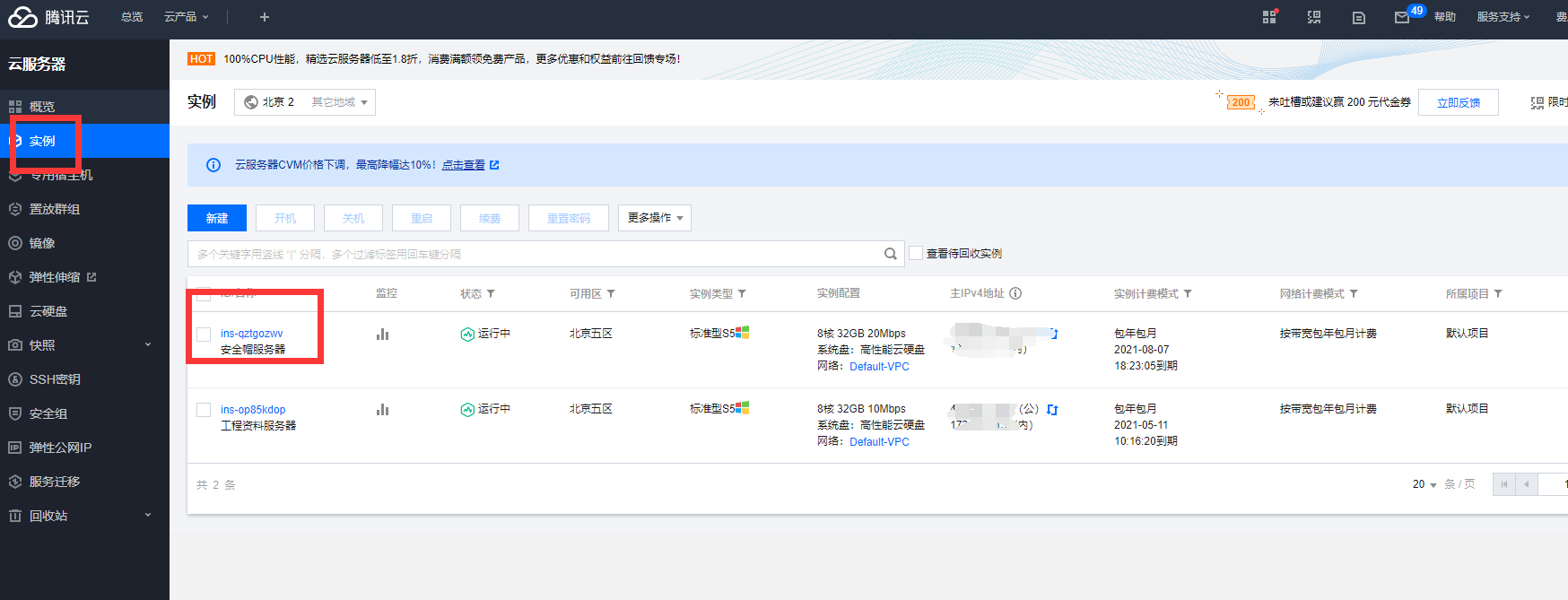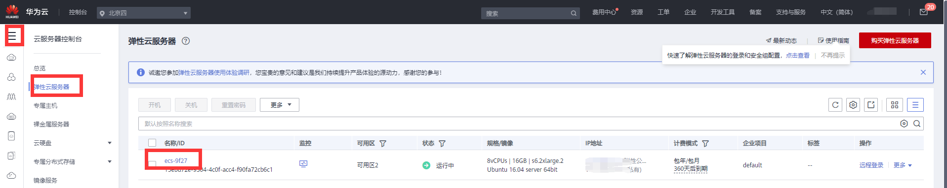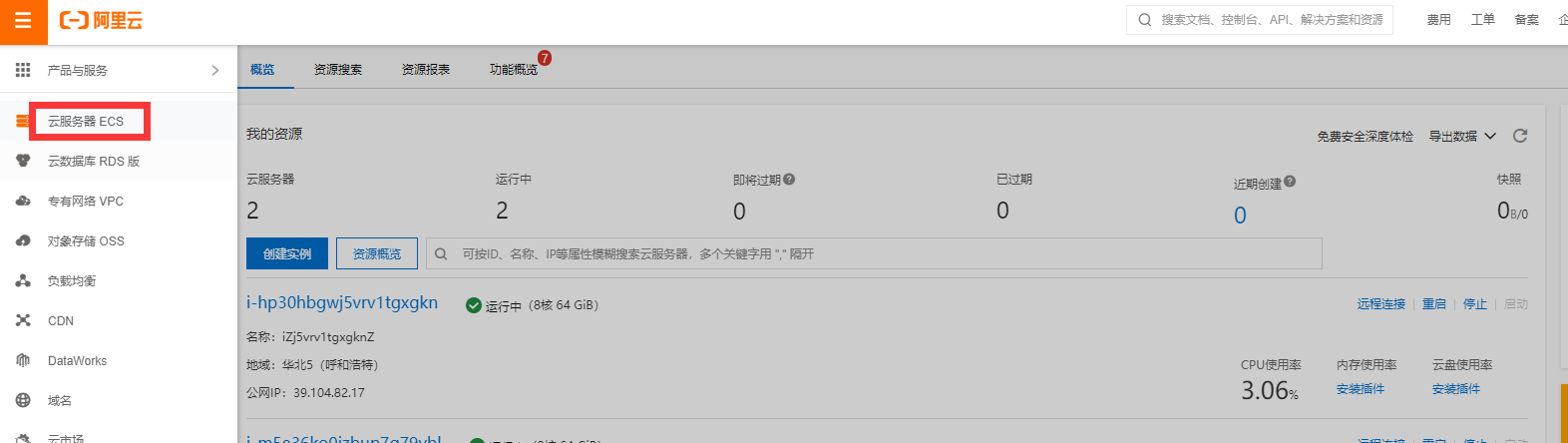 同样登录后找到控制台界面,然后在弹出的资源实例列表中点击对应的服务器实例名称