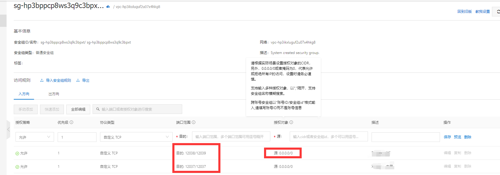 多端口号如上图12038/12039 ,单端口号就是12037/12037 源一般是0.0.0.0/0,具体看说明