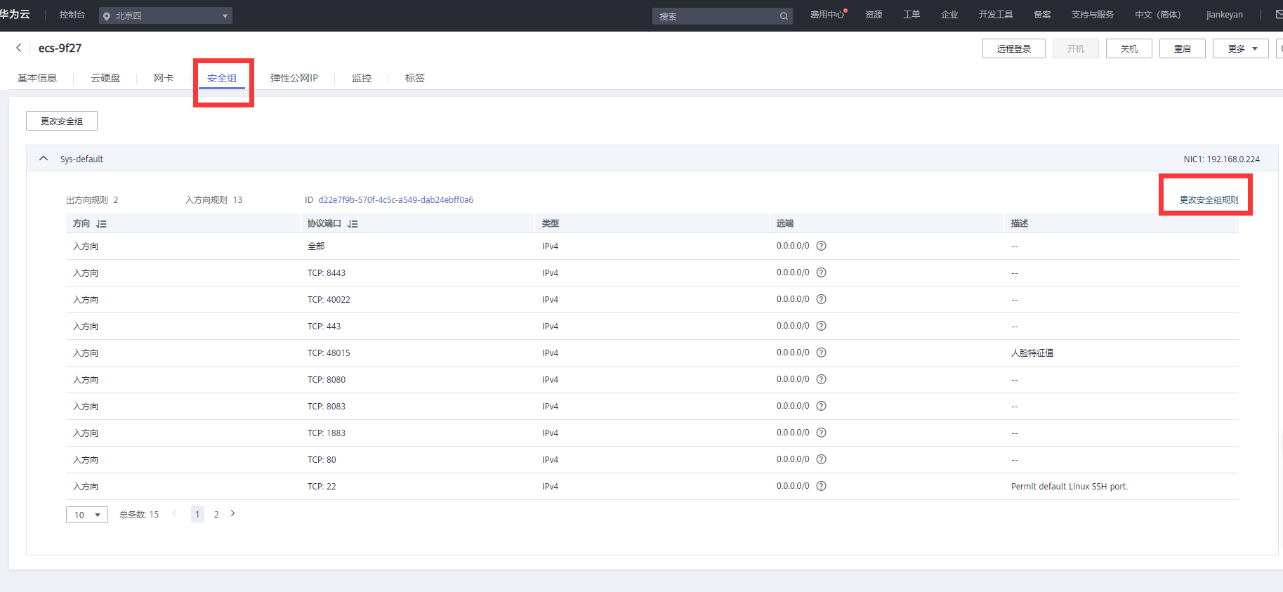 进入后切换到安全组页签 ,然后选择右边的更改安全组规则
