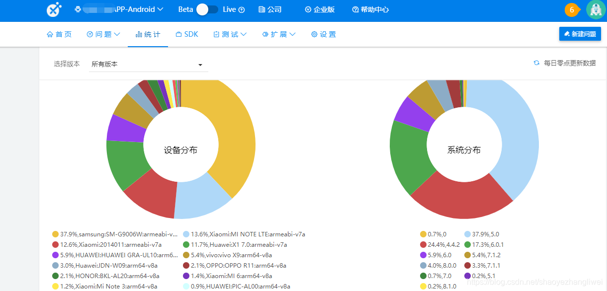 5)很全的统计功能,统计了每个版本的错误的机型,系统版本分布等信息。
