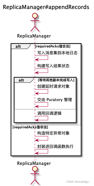 appendRecords方法将给定的一组分区的消息写入对应Leader副本,并根据PRODUCE请求中acks的设置,有选择地等待其他副本写入完成。然后,调用指定回调逻辑。