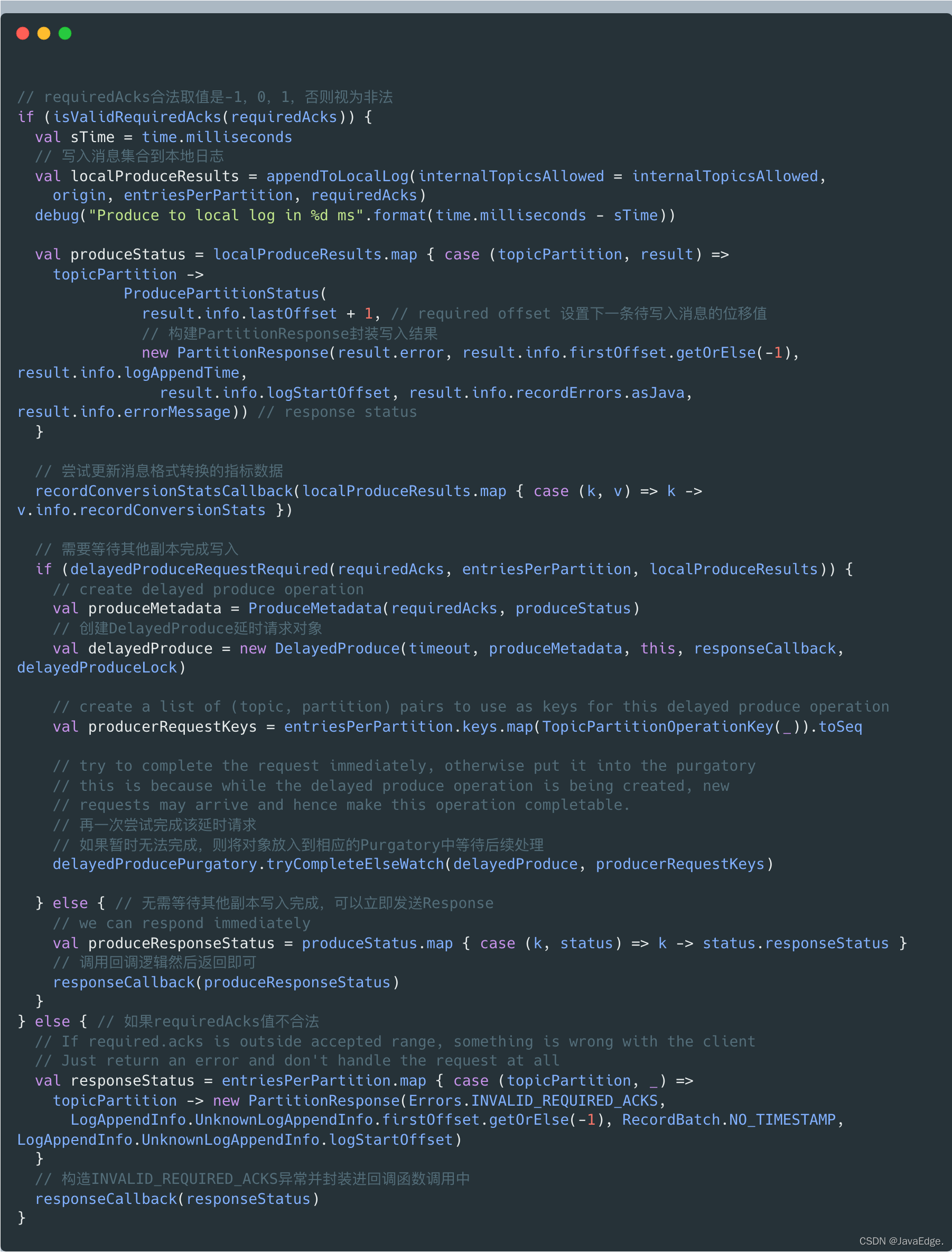 而有部分分区成功写入,部分分区写入失败,则可能偶发的瞬时错误导致。此时,不妨将本次写入请求放入Purgatory,给个重试机会。
