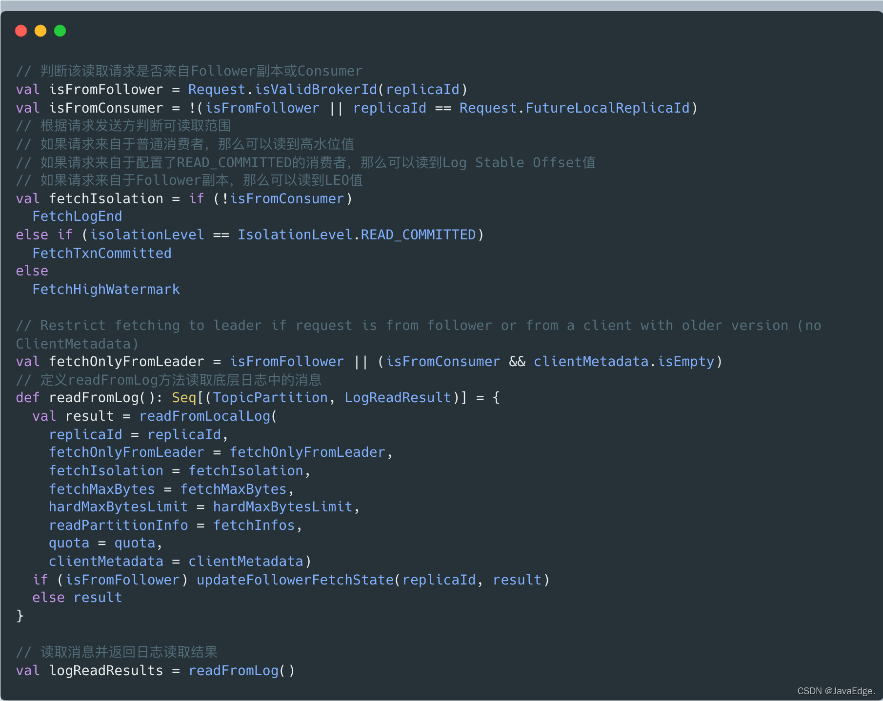 确定可读取范围后,调用readFromLog读取本地日志上的消息数据,并将结果赋给logReadResults变量。readFromLog调用readFromLocalLog,在待读取分区上依次调用其日志对象的read方法执行实际的消息读取。