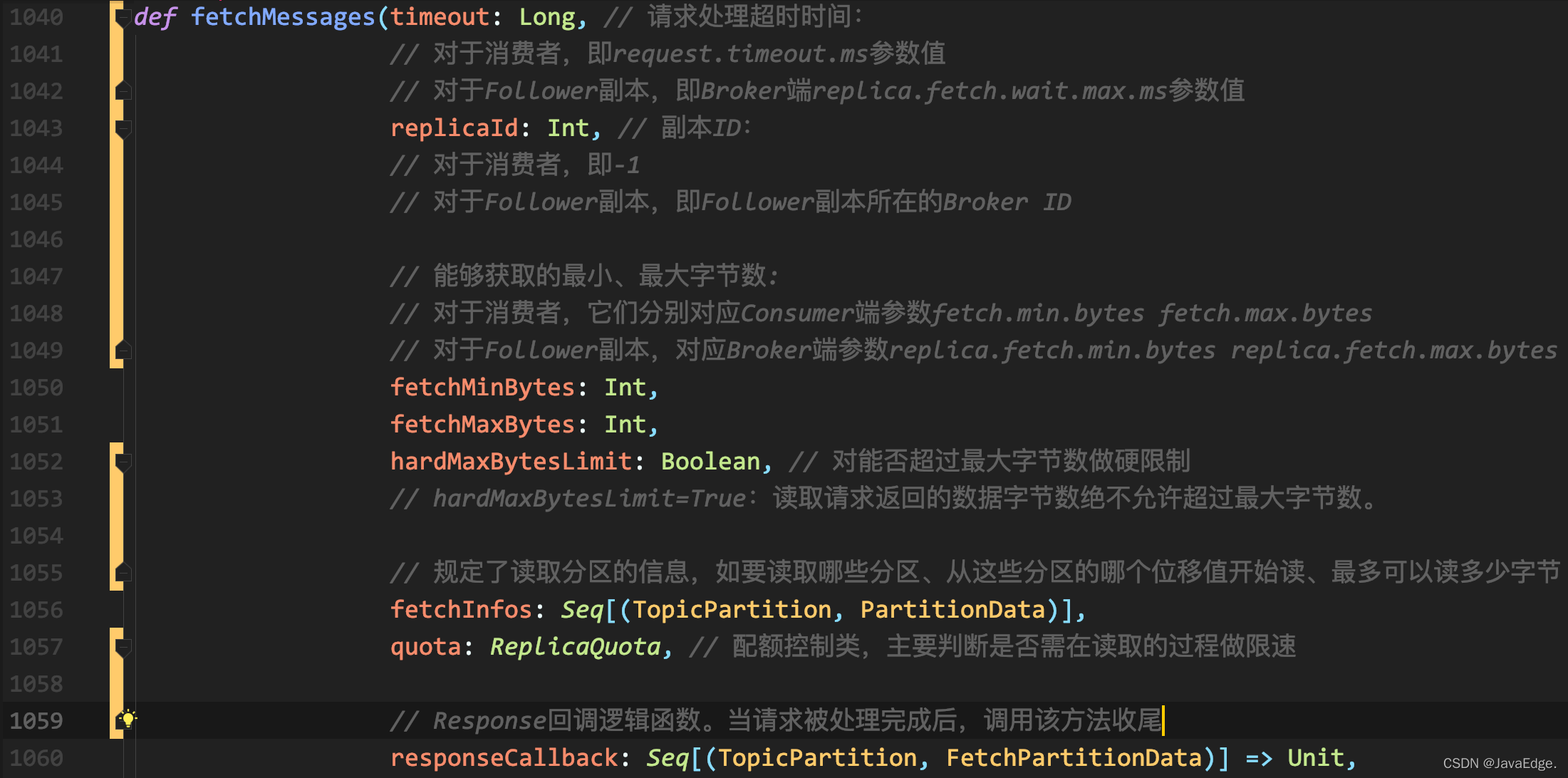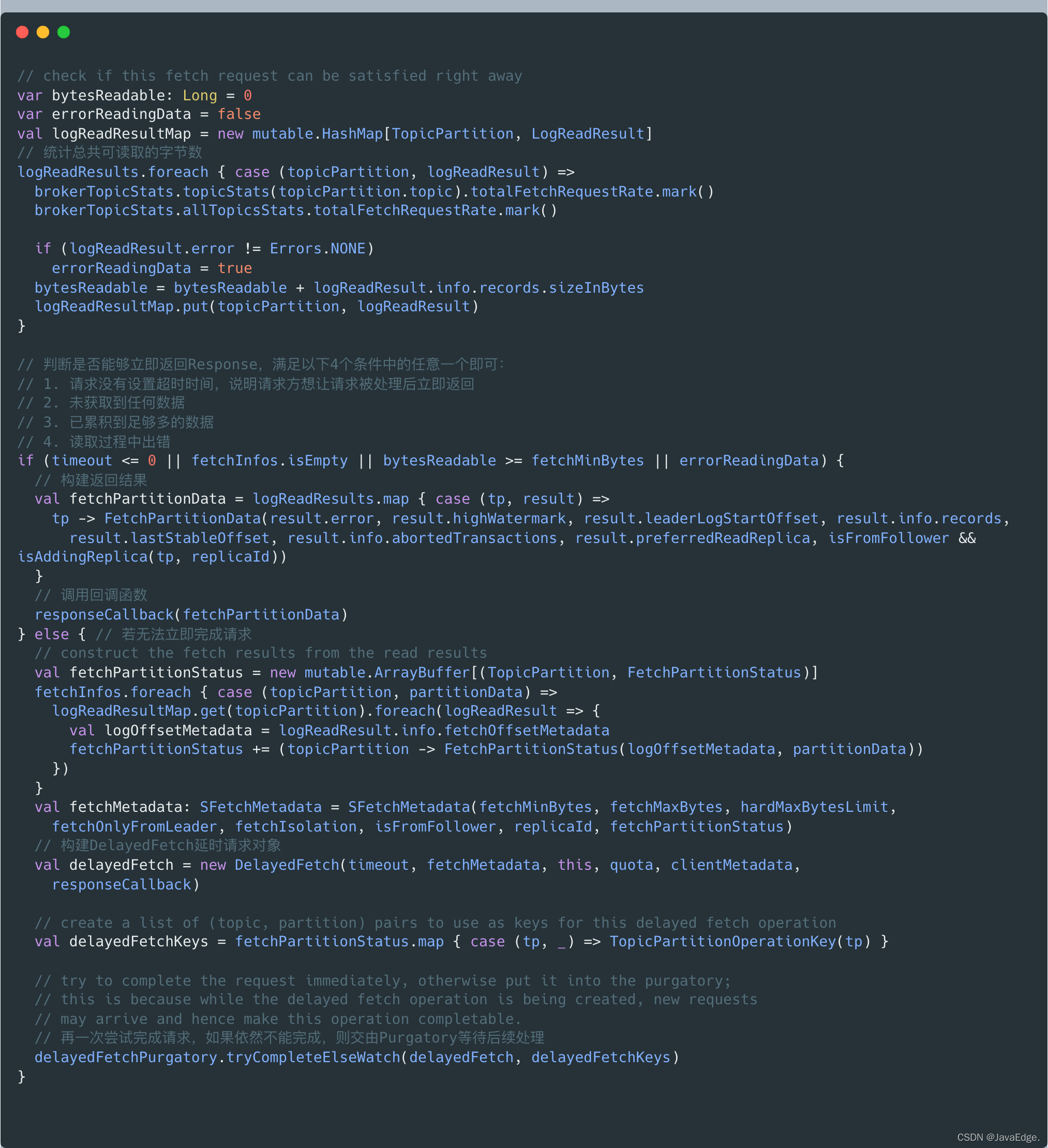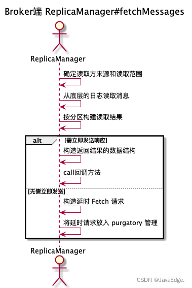 fetchMessages也可能会延时处理FETCH请求,因Broker端必须要累积足够多数据后,才会返回Response给请求发送方。