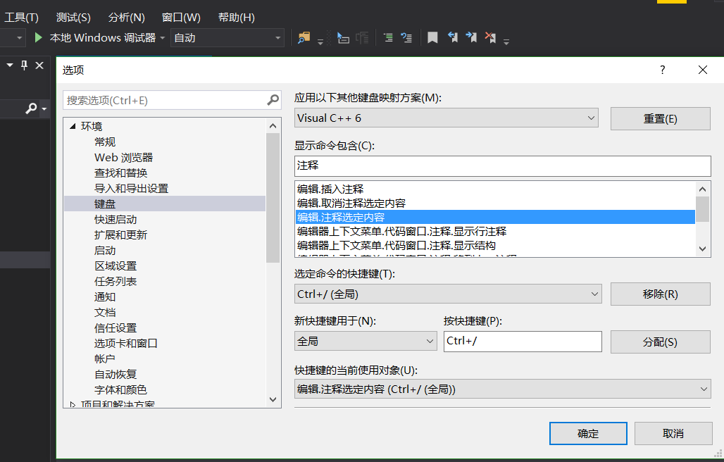 2:选择 “编辑 注释选定内容” 在下方 分配前的输入框中,按下 “Ctrl + / ” 再点击分配 即可完成快捷键的修改