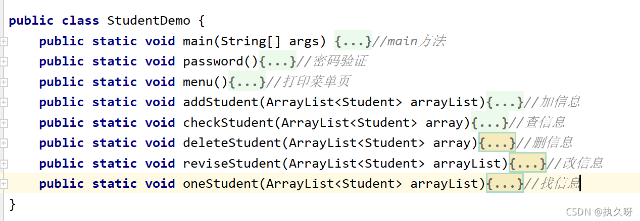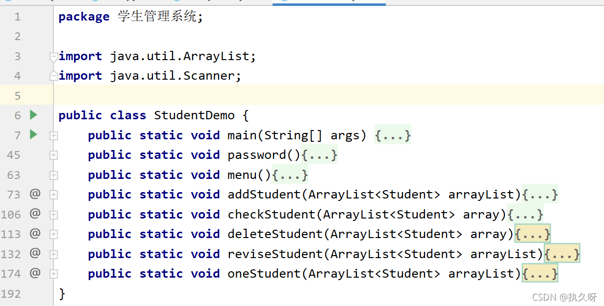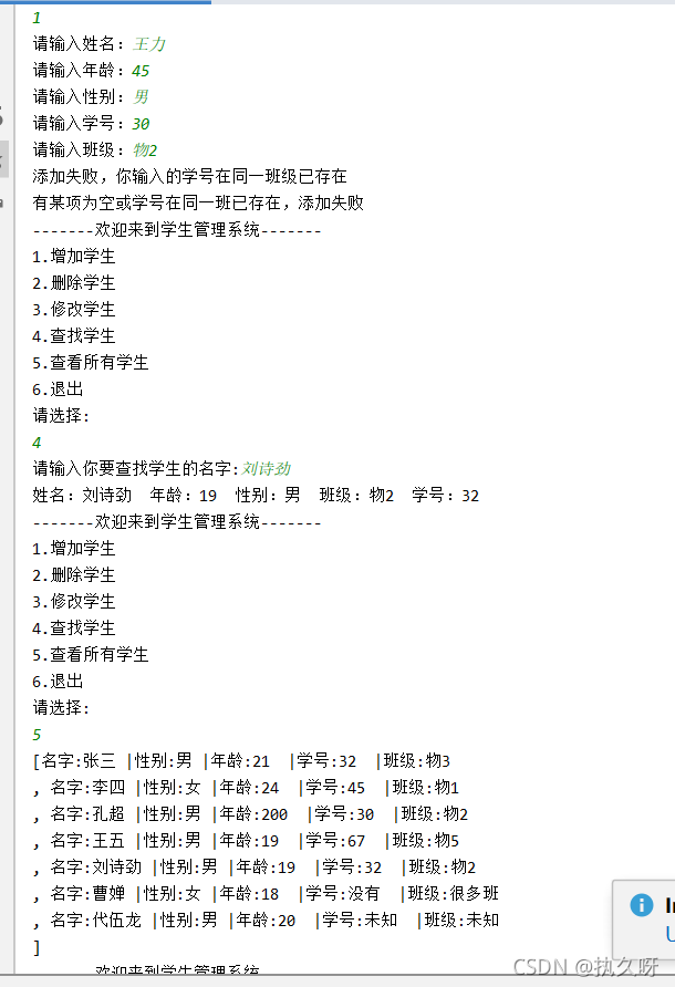 【摘要】 目录一、前言二、学生管理系统主要功能在学生类下在学生总部类下: main方法:登录密码验证:打印菜单:增加学生信息:查看学生信息:删除学生信息:修改学生信息:查找学生信息:代码效果演示图:一、前言 我们前面写了通讯录管理系统,现在我们来写个学生管理系统,其实主干代码都一 不过,在学生管理系统中我添加和优化了许多功能,如【登录密码验证,异常处理,非空判断,,防止重复添加】等。二、学生...