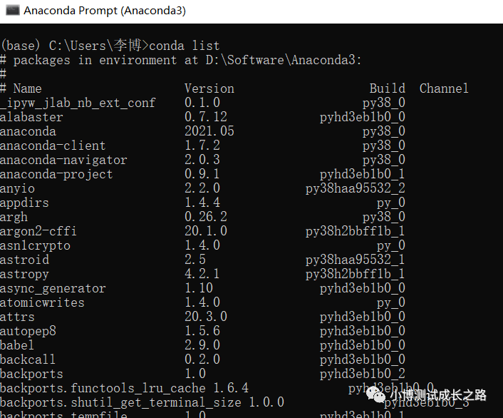 2.“开始菜单 → Anaconda3(64-bit)→ 右键点击Anaconda Prompt → 以管理员身份运行”,在Anaconda Prompt中输入conda list,可以查看已经安装的包名和版本号。若结果可以正常显示,则说明安装成功。