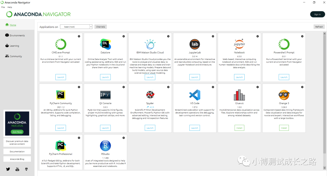 1、“开始菜单 → Anaconda3(64-bit)→ Anaconda Navigator”,若可以成功启动Anaconda Navigator则说明安装成功。启动成功后的页面: