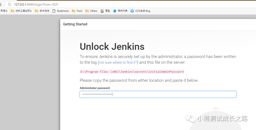 浏览器第一次访问http://127.0.0.1:8080/ ,会提示你输入一个默认的admin密码(如果页面长时间还没加载出来,可以重启一下Jenkins服务,或者多等一会,要注意8080端口没有被其他程序占用),这个在页面有提示密码对应存放的文件,在密码输入框输入对应的密码点击Continue按钮