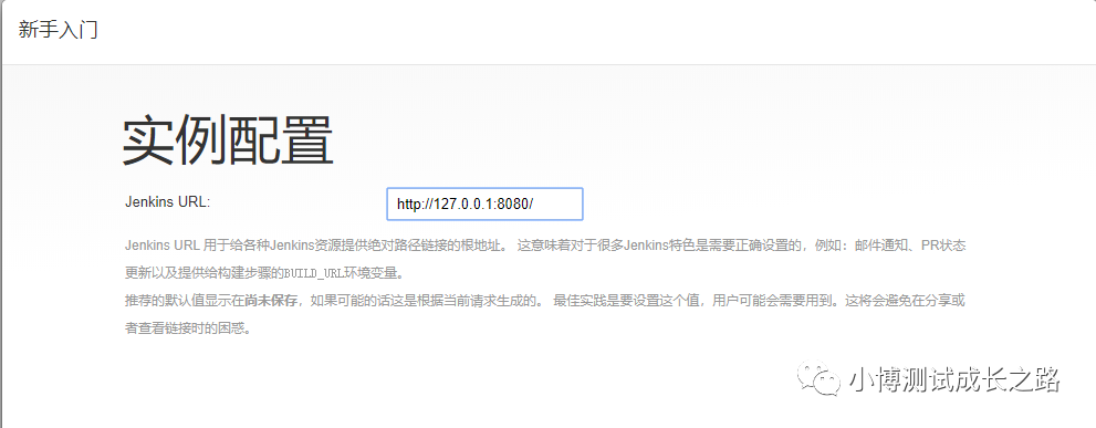 用户创建完毕之后,会进入 实例配置页面,这里建议大家把Jenkins URL的地址设置为对应服务器的ip+端口,不要用localhost ,避免后续用到这个地址时,发个其他人的链接打不开这个地址。