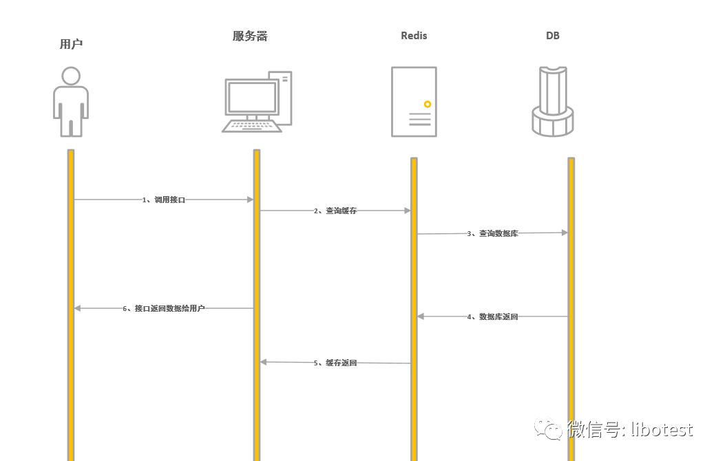 加入缓存后,用户第一次调用接口,先检查缓存中是否有对应数据,命中缓存后直接返回,没有的话再查数据库,从数据库查到数据后,存入缓存中,再返回。下次再查询时,就可以直接从缓存中读取数据。