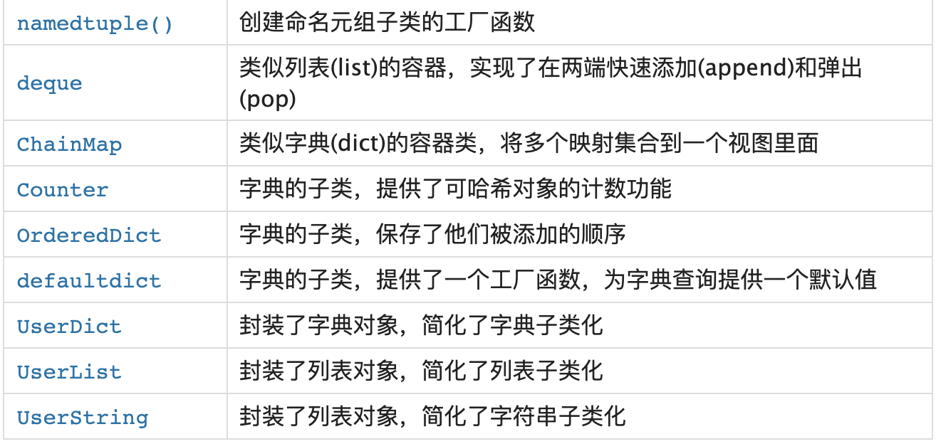 这个模块实现了特定目标的容器,以提供Python标准内建容器dict,list,set, 和tuple的替代选择。