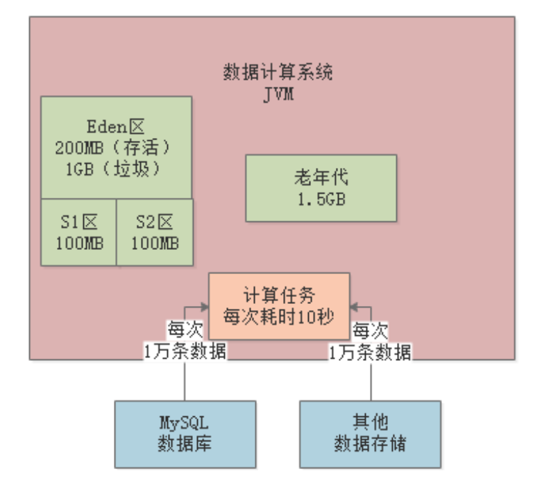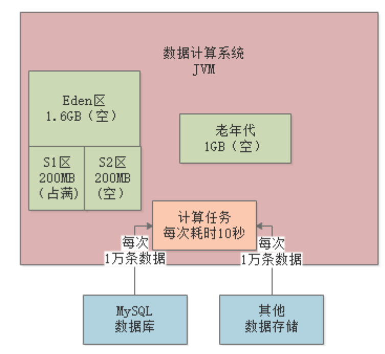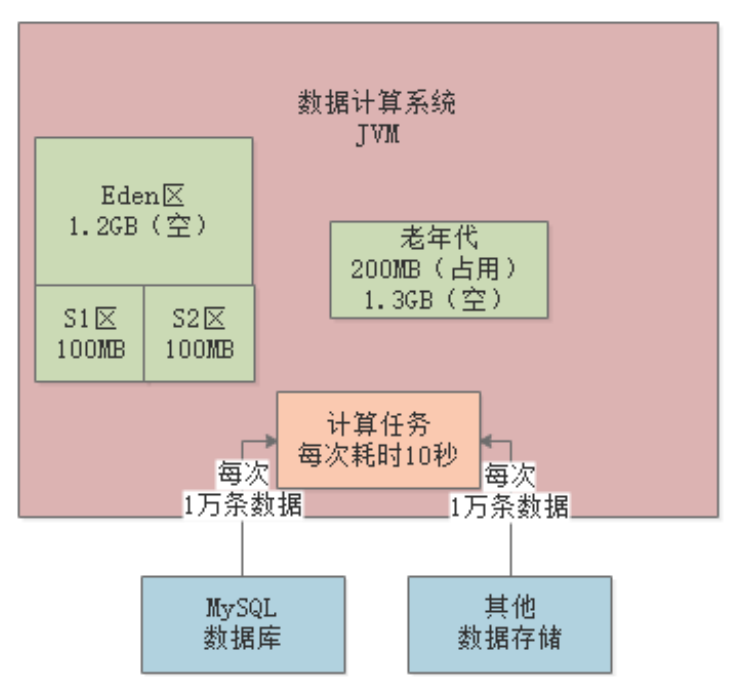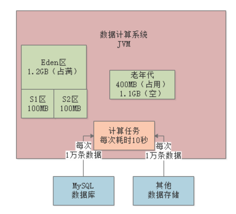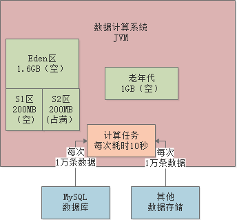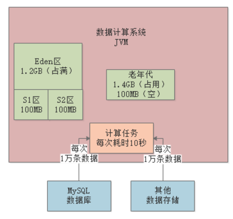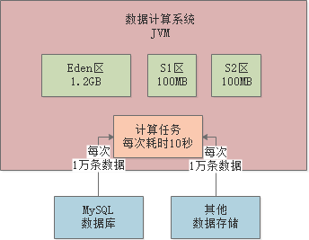 某数据计算系统,日处理亿级数据量。系统不断从各种数据源提读数据,加载到JVM内存进行计算处理: