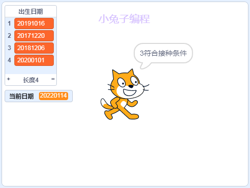 点击绿旗,初始化列表,加入四个小朋友的出生日期:20191016、20171220、20181206、20200101<
