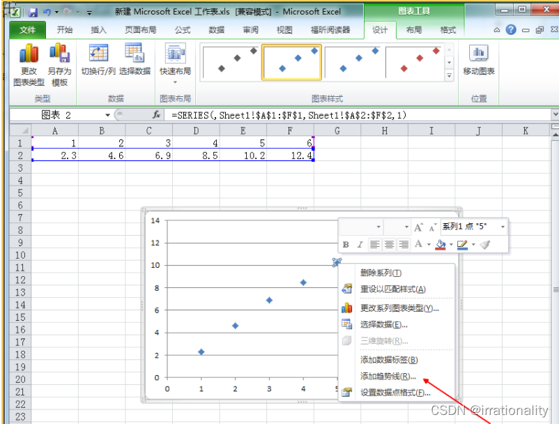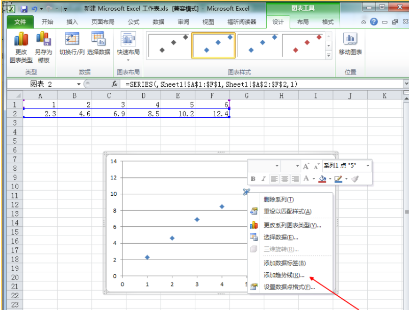 第三步:选中散点图之后,会出现图表,点击上面的任何一点。然后右击,选择添加趋势线。
