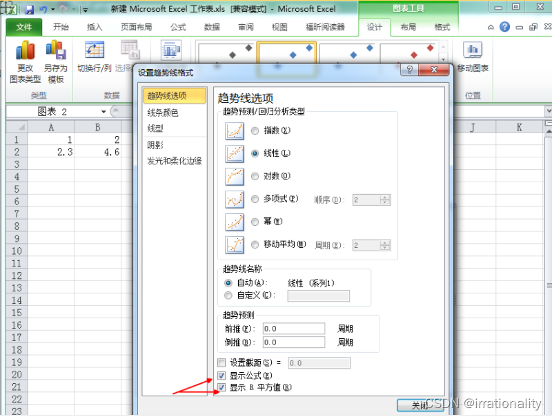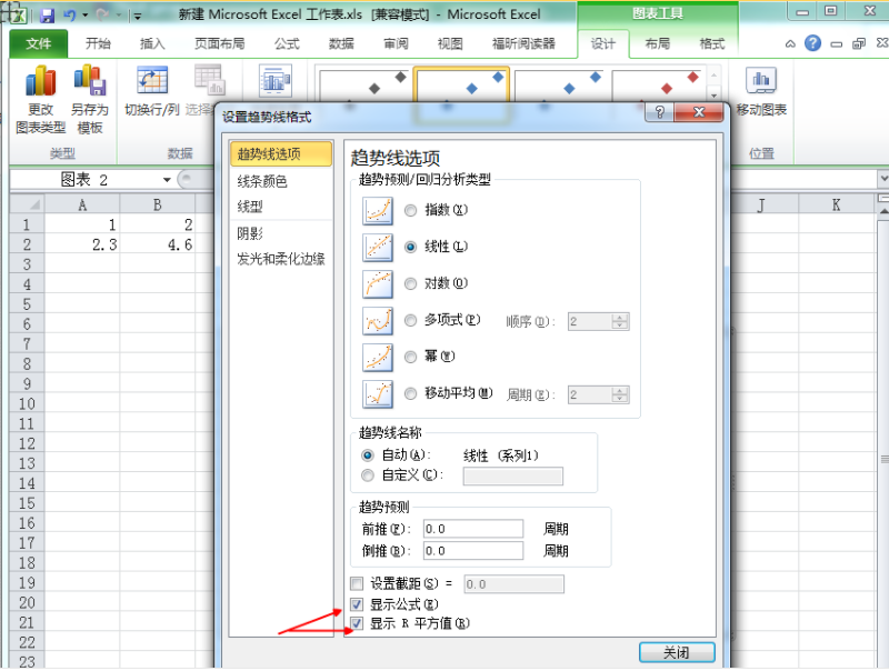 第一步:输入你要回归的数据 第二步:点击插入,选择散点图 第三步:选中散点图之后,会出现图表,点击上面的任何一点。然后右击,选择添加趋势线。 第四步:弹出一个窗口,选择窗口箭头所示的两个选项,必须要选,这两个选项可以看出数据之间的相关性。 第五步:点击图标中...