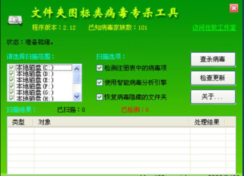 该病毒主流杀毒软件基本都能查出来,但是"只能查却不能杀",就连对U盘病毒效果一向不错的usbclear 也束手无策(里面有个文件夹图标专杀工具,但是杀不了),但是可以用任软工作室(www.rensoft.com.cn)的文件夹图标类病毒专杀工具来杀除,软件截图如下: