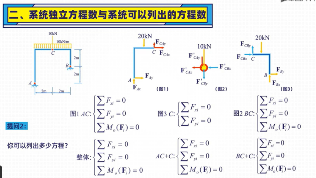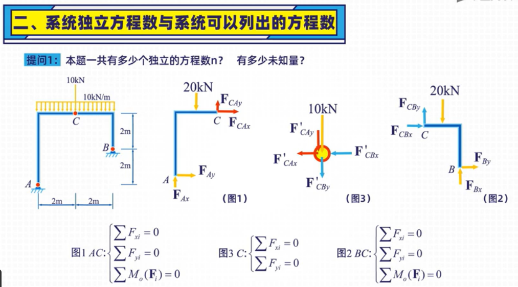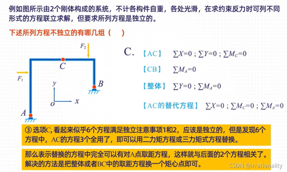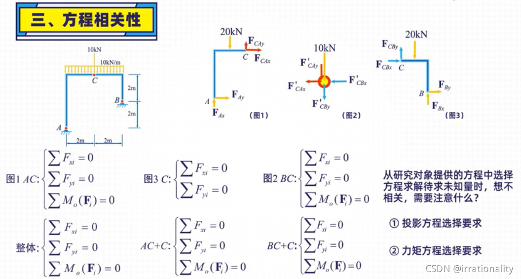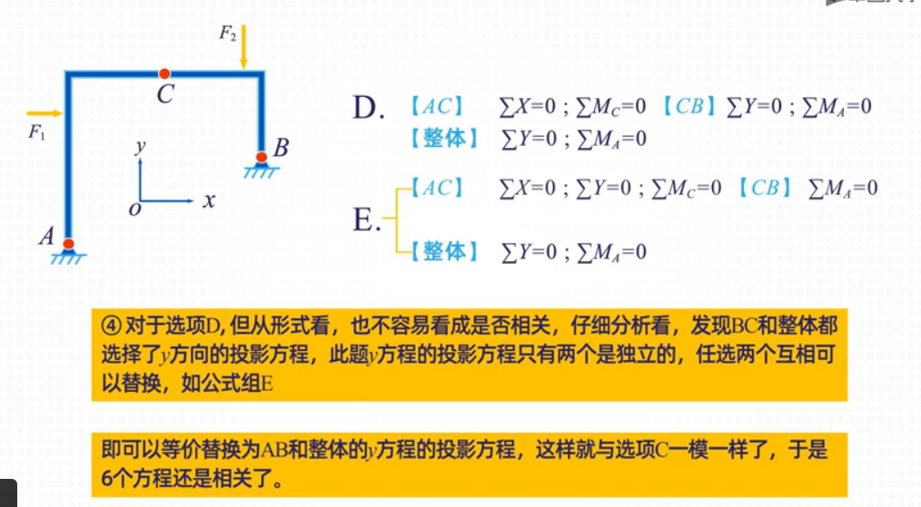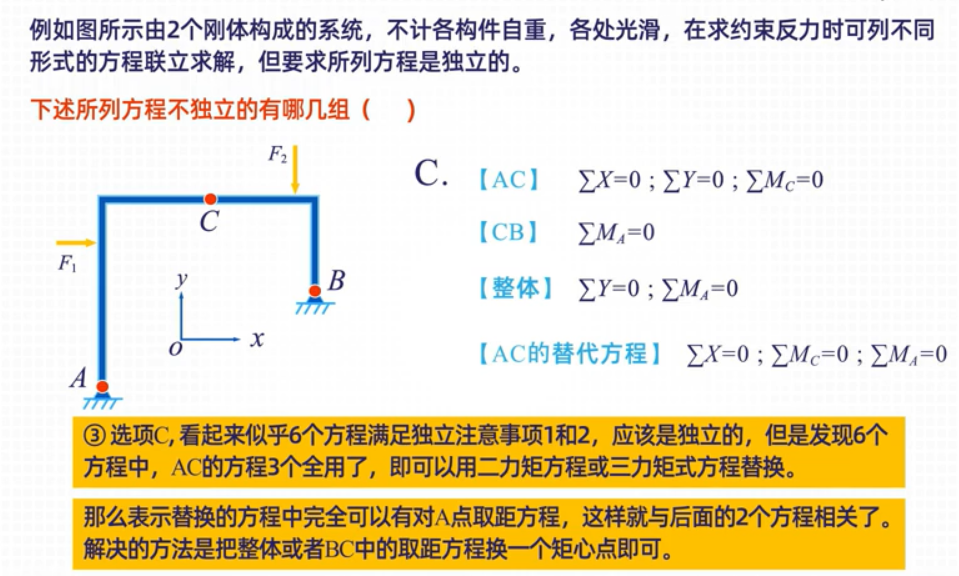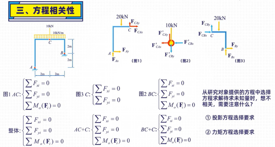 解决相关性问题:例如选取了AC、C在x方向的投影方程,就不能再取整体研究方程。很容易明白他们是线性相关的。