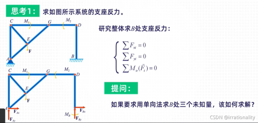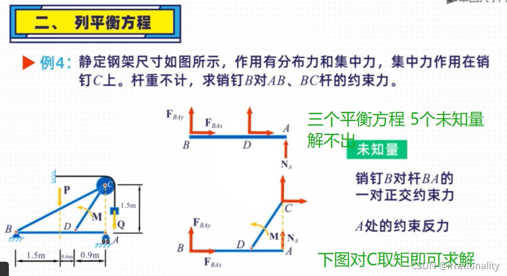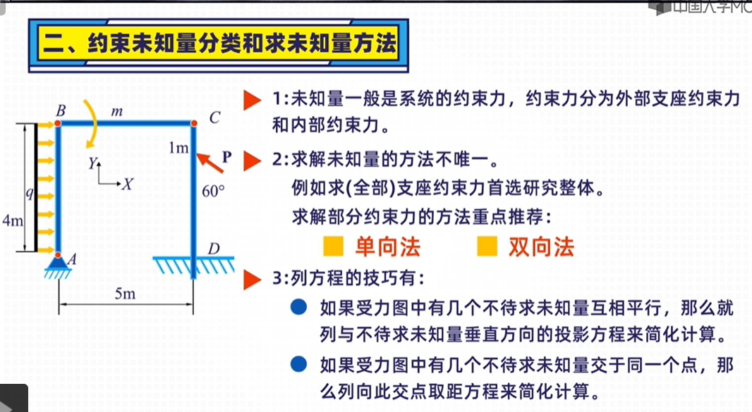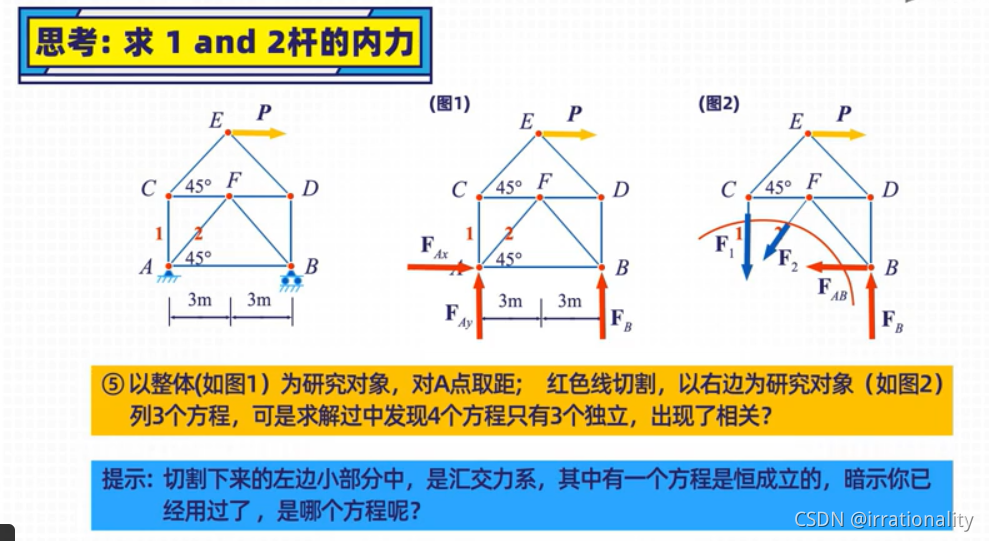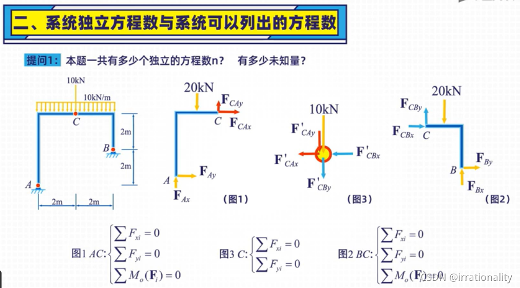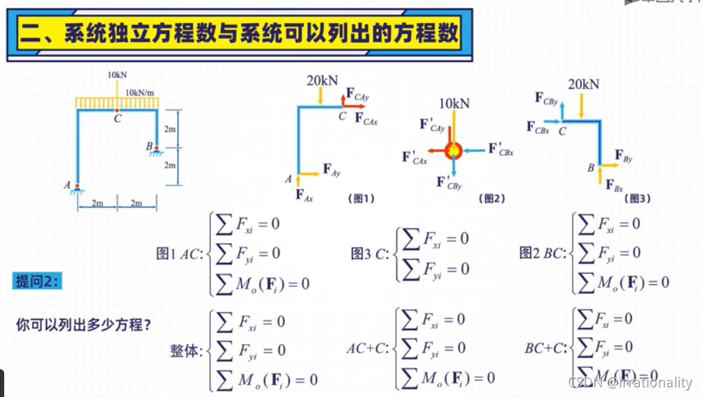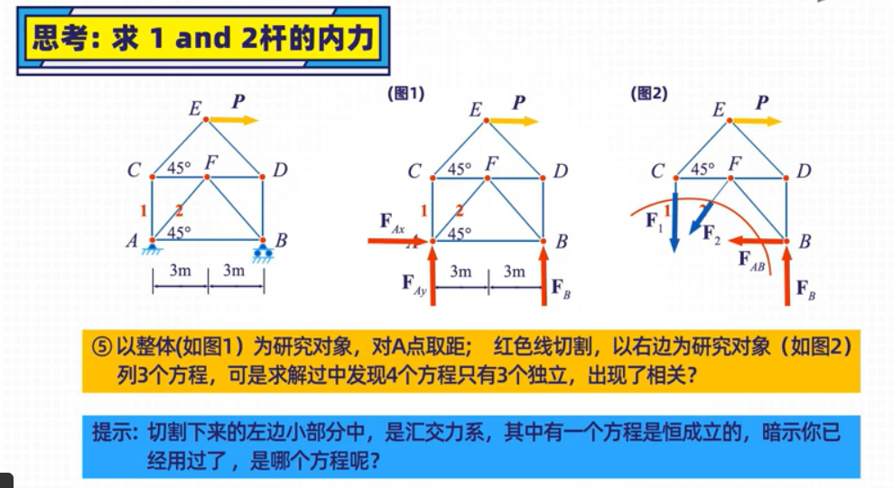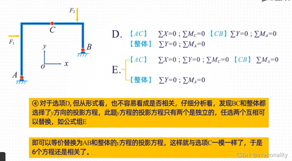 解决相关性问题:例如选取了AC、C在x方向的投影方程,就不能再取整体研究方程。很容易明白他们是线性相关的。