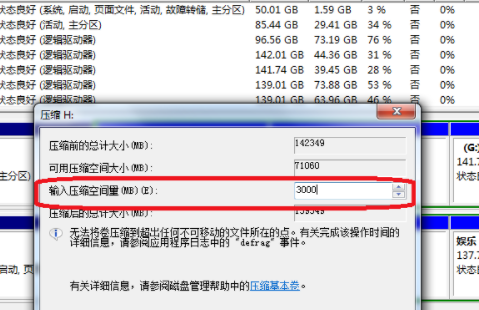 进入压缩卷页面设置压缩的空间,在设置压缩空间的时候,我们需要考虑要能容纳H盘的数据,压缩完成后会多一个可用区域。我们将H盘的数据转移到新压缩的区域,然后删除H盘,便得到一个可用的分区。