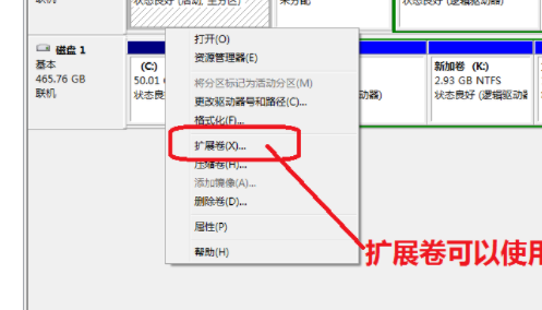 再次选中C盘使用鼠标右键单击弹出下拉菜单,我们发现C盘的扩展卷已经不是灰色了,可以点开了。
