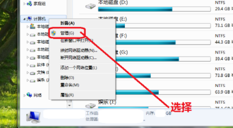 打开计算机页面选择计算机使用鼠标右键单击弹出下拉菜单,选择管理按钮。