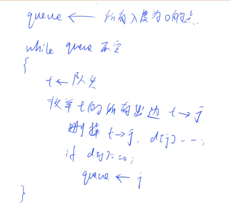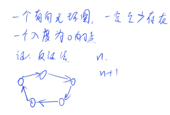 反证法:如果不存在入度为0的点,那么可以反复往前找,那么找到n+1次(比边数多1,那么一定会产生重复,那么就一定成环)