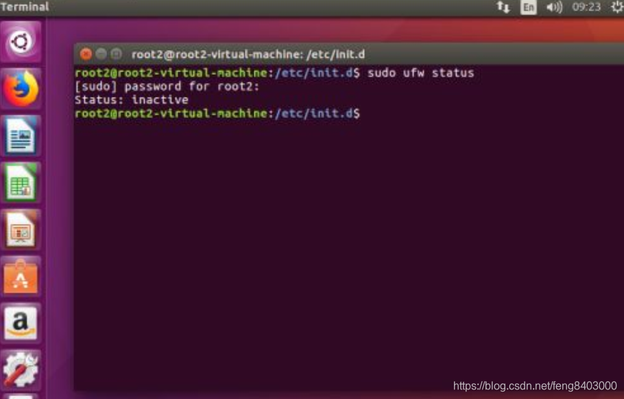 在Ubuntu中 我们使用sudo ufw status命令查看当前防火墙状态;inactive状态是防火墙关闭状态 active是开启状态。