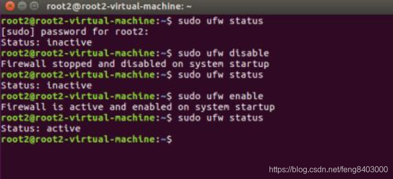 在Ubuntu中 我们使用sudo ufw enable命令来开发防火墙 通过sudo ufw status命令查看开启防火墙后的状态为active 说明防火墙开启成功。