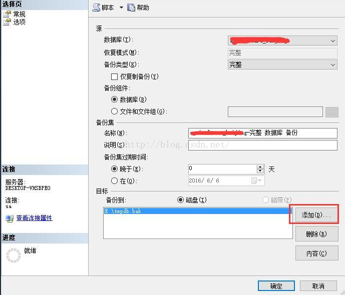 选择“添加...”,点击“.....”,选择需要保存的文件路径,并输入保存的备份文件名“tmpdb.bak”。依次点击各界面上的 确定 按钮。即完成备份。