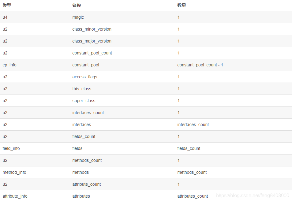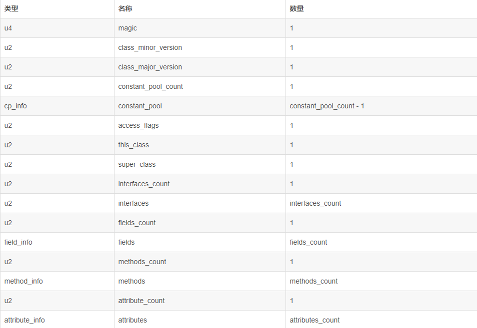 上图中都是以16进制表示,接下来挨个分析其中的内容表示什么意思。class文件中存储的数据可以参考下表: