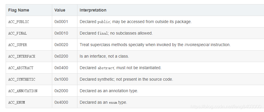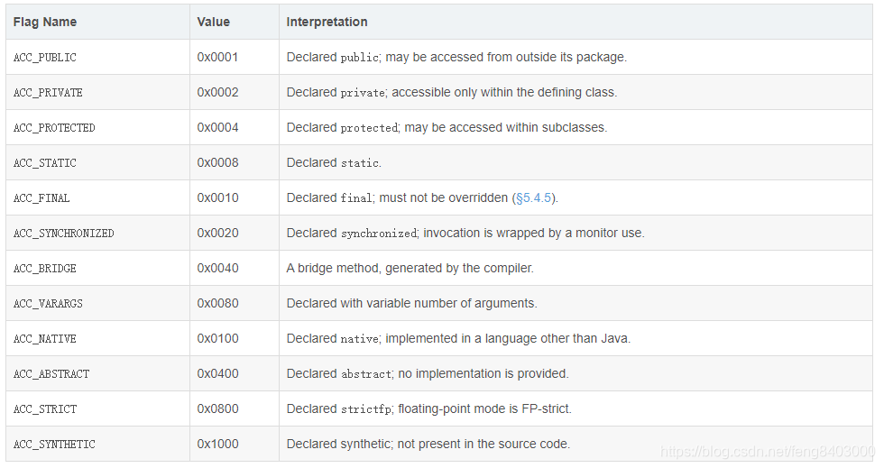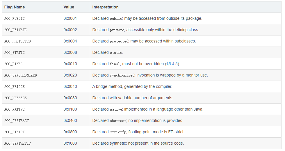 ----00 01:access_flags=0x0001=ACC_PUBLIC,方法的访问标志如下表: