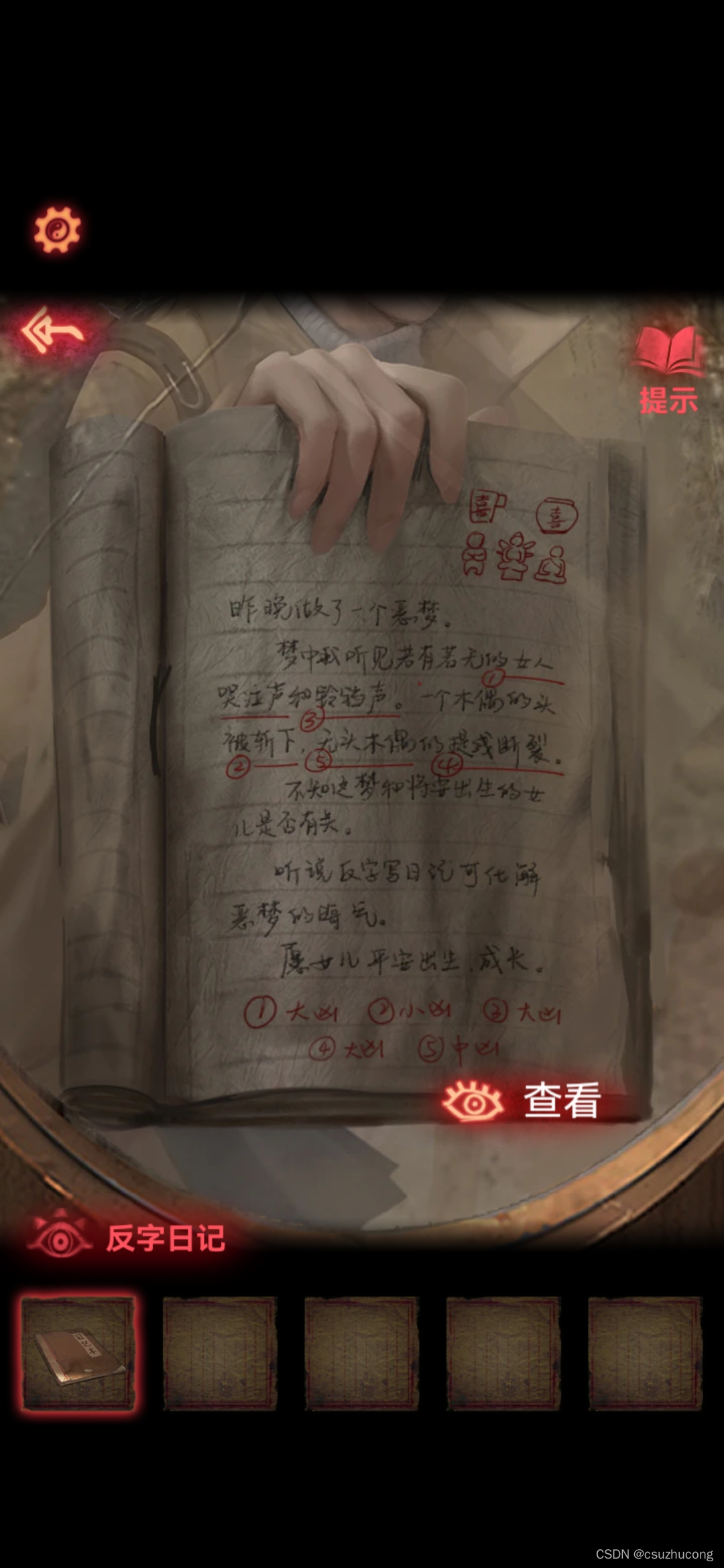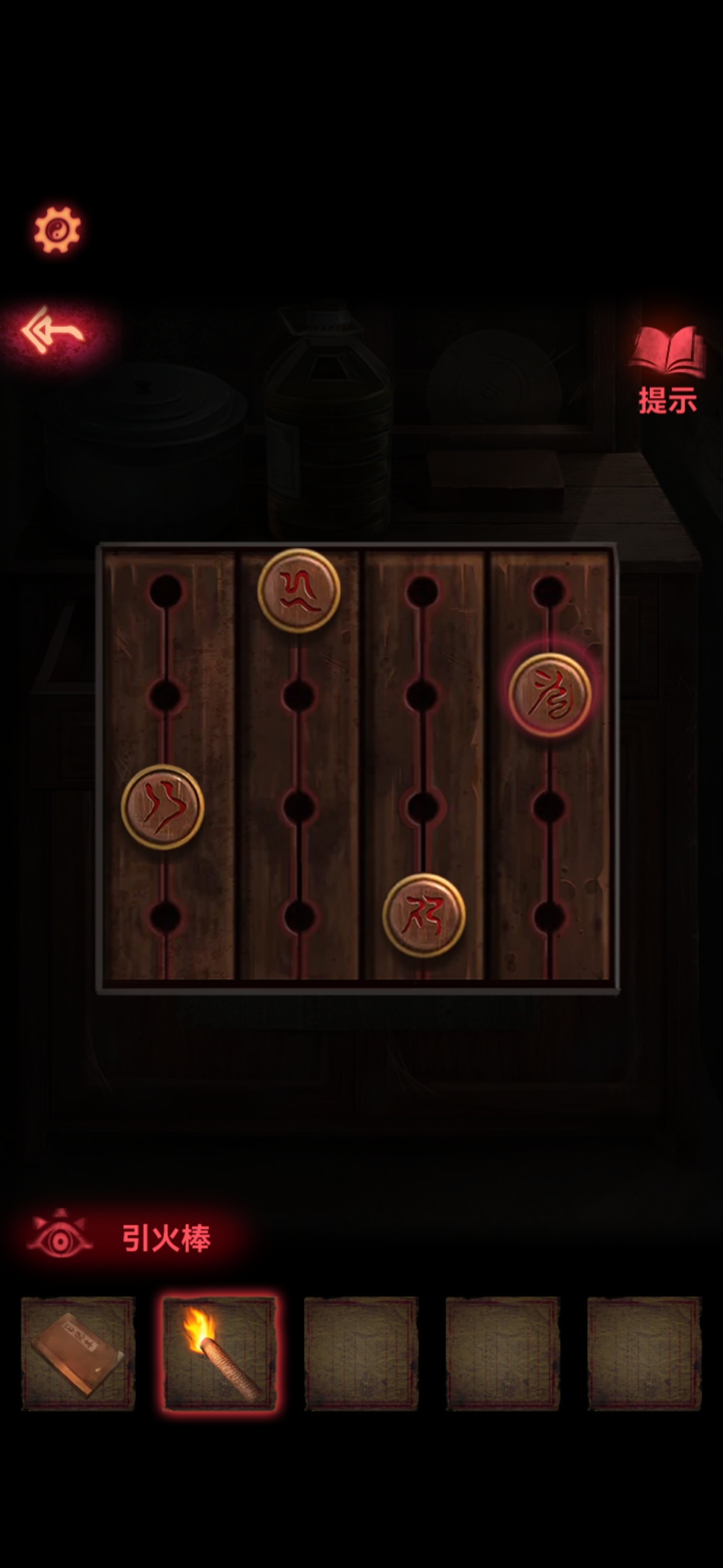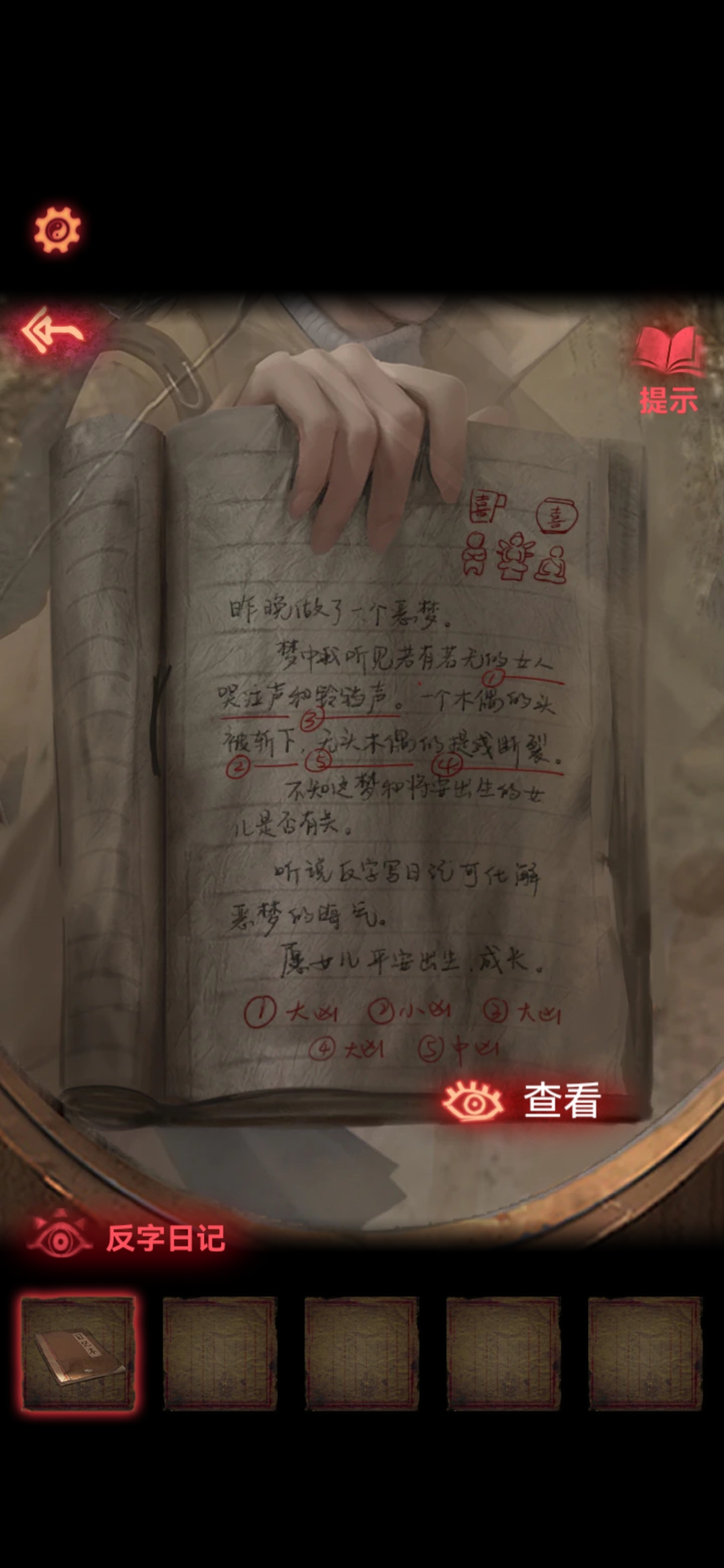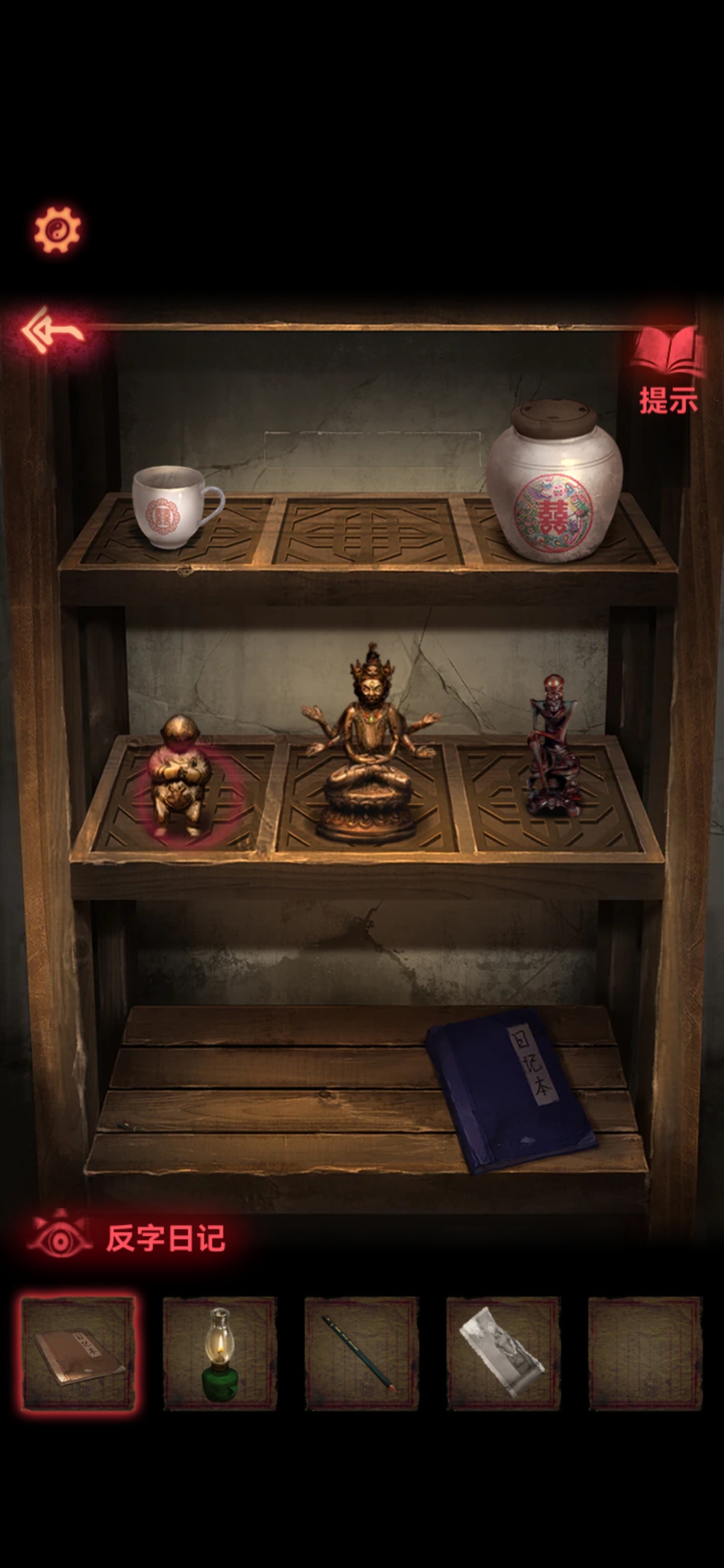 取第三个房间拿到煤油灯,点燃。再根据日记本上面的提示,把5个东西摆好,拿到唱片。